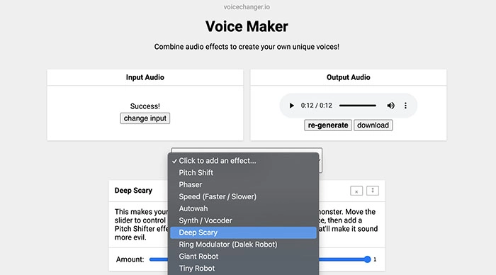 Voice Changer is another useful scary voice changer that is worth checking out. The web-based tool can transform voices and audio into a wide selection of sounds, for instance, creepy aliens, spooky ghosts, etc. You can also add various scary effects for customization.