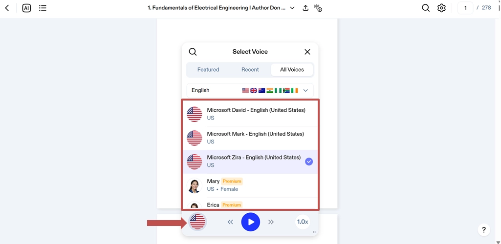 3. Select Voice: Pick from available AI voices and adjust playback speech.