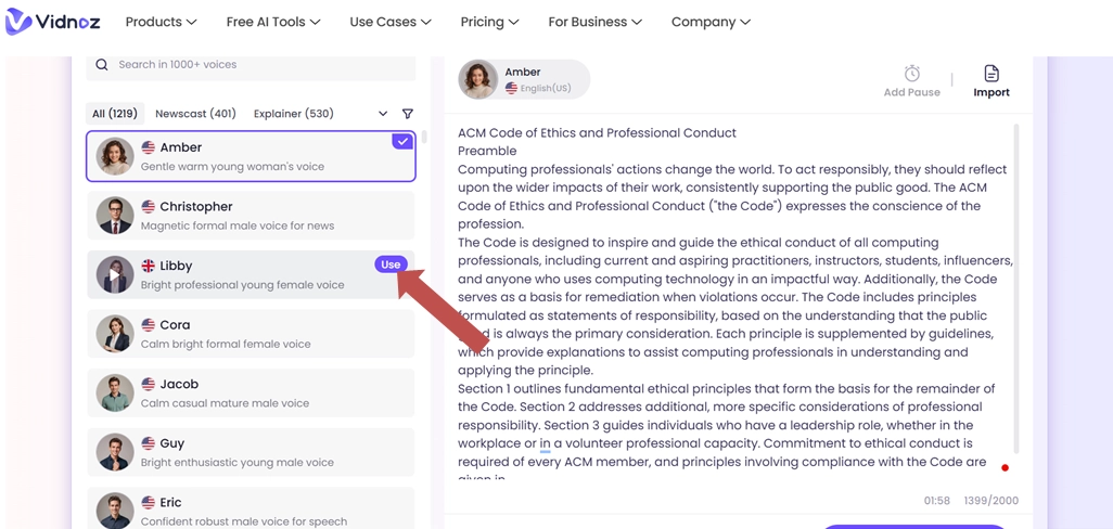 Step 3: Choose a voice from the available voices and click on 'Use' to use it.