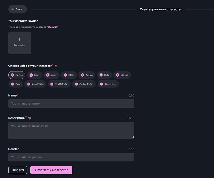 - Basic settings for your character: Fill out more info for your digital friend now - things like their name and if they're a man or woman. You can explore Wikipedia to get the authentic bio of your celebrity character. Also, use the description part to write about their personality, what kind of relationship you want, and how they talk to you.