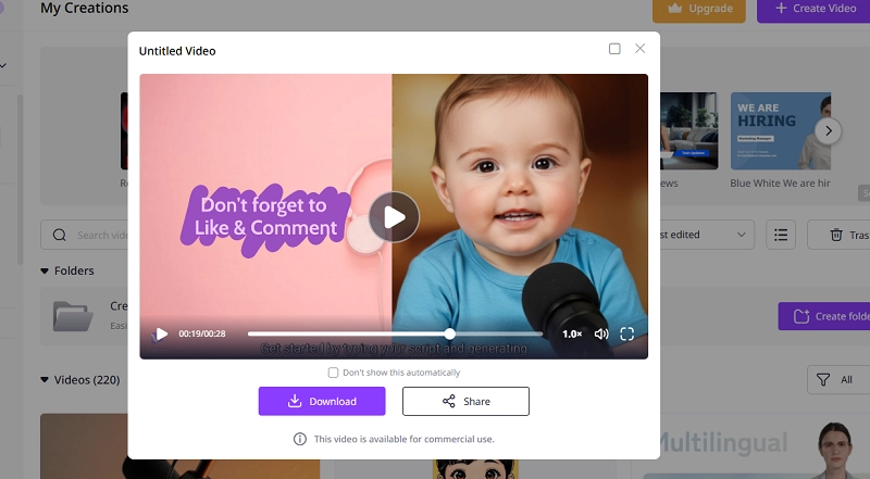 Taking things a step further, the free AI video generator also helps build a full-fledged talking baby podcast consisting of multiple scenes, background music, and enhanced visuals.