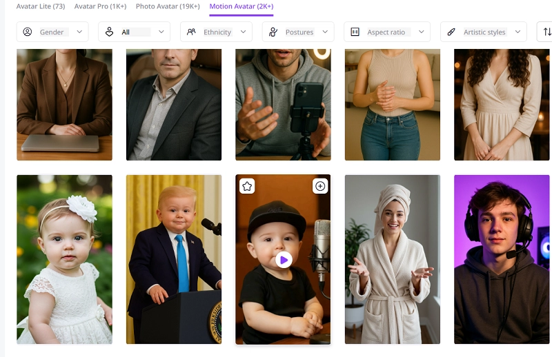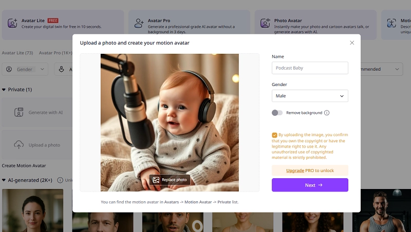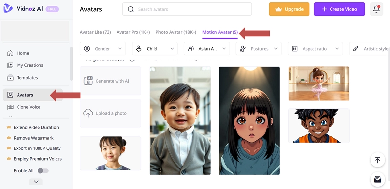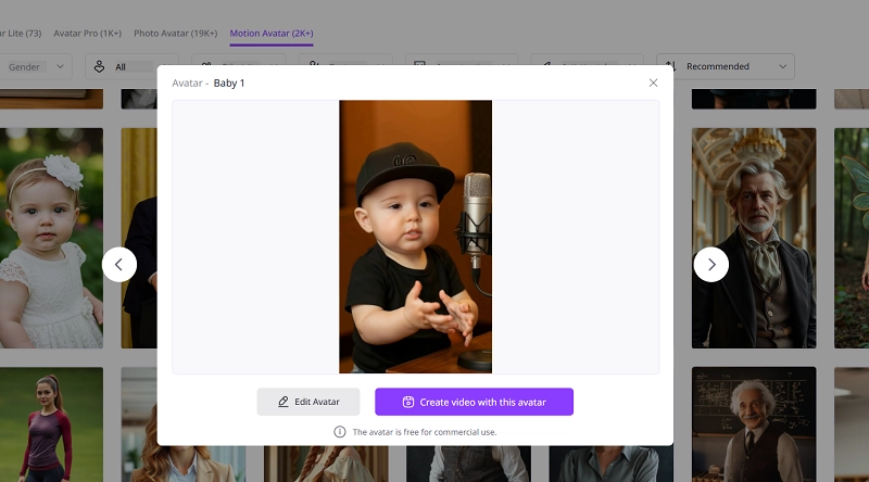 Click Avatars on the left vertical menu and choose the Motion Avatar feature to start creating a talking baby.