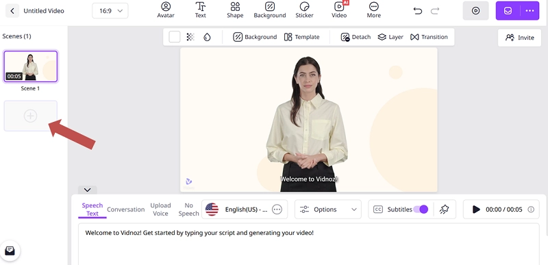Click on the plus icon on the left menu to design a sequence of scenes for your podcast. Apply a unique baby avatar to each by selecting a particular scene, then tapping on 'Avatar' and then 'Motion Avatar' options at the top.