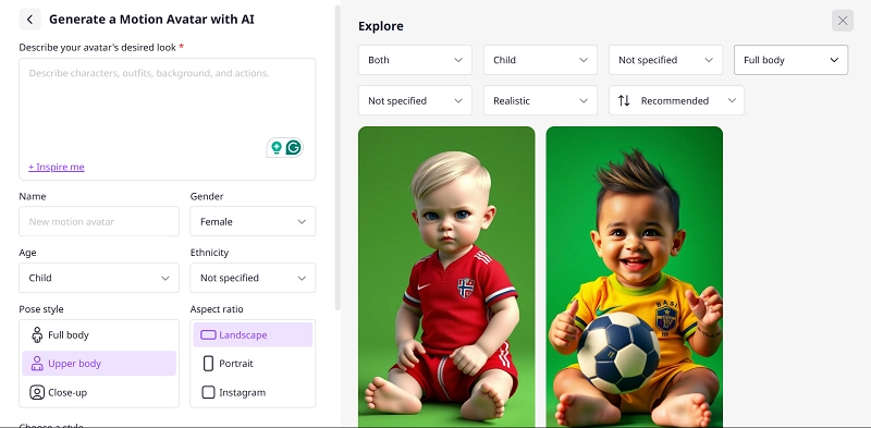 Vidnoz offers an internal image generation tool that creates photorealistic baby images from scratch. Found under Avatars > Motion Avatar > Generate with AI, this feature is perfect for producing a base image quickly and creatively.