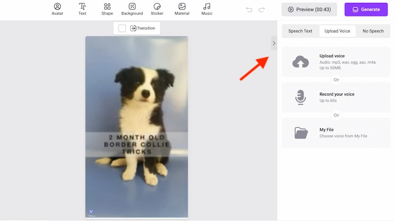 Belki de köpeklerinizin kişiliğini sergileyecek sahneler ve diyaloglar için zaten bazı fikirleriniz vardır. Neden fikirlerinizi seslendirme ve altyazılarla komik bir konuşan köpek videosuna dönüştürmeyi denemiyorsunuz? Popüler yaklaşımlardan biri, köpeğinizin bir videosunu çekmek ve ardından Vidnoz'un yapay zeka video oluşturucusunu kullanarak bir köpek seslendirmesi eklemektir.