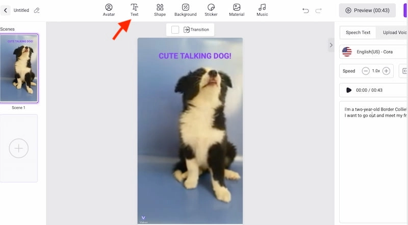 Konuşma ayarı sütununu açın. Ardından, sesinizi kaydedebilir veya Metinden Konuşmaya Yapay Zeka aracını kullanarak senaryonuza dayalı bir köpek seslendirmesi oluşturabilirsiniz. Metinden Konuşmaya Yapay Zeka aracını kullanıyorsanız, köpek seslendirmesini komik hale getirmek için konuşmanın dilini ve stilini değiştirin .