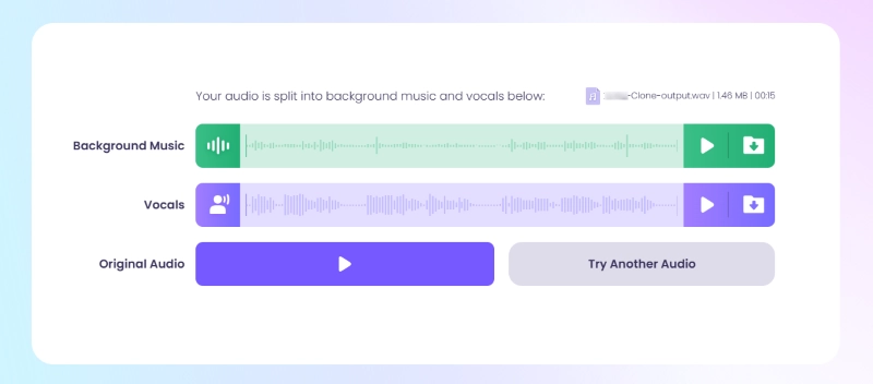 Step 3. The audio is processed by the AI system, which isolates the voices from the instrumental. After a few seconds, the separated vocals and background music will be presented on the interface, and you can preview the effect of separation. Then, save the freshly formed instrumental track to your computer.