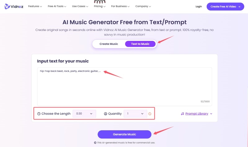 HQ Royalty-Free Music: High-quality original music is at your fingertips with Vidnoz AI Music Generator's rich set of options and libraries. Royalty-free AI music allows you to stop worrying about copyright issues.