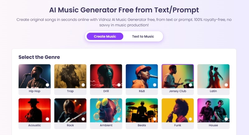 Vidnoz AI Music Generator is an excellent online text to song generator free. It turned out to be one of the fastest-producing outputs. Except for the text to music feature, the AI music generator provides a more creative music generation option. You can select the genre, mood type and theme you like. It includes old-school alternatives and classic symphonic styles. Explore how to turn my words into a song online free as follows.