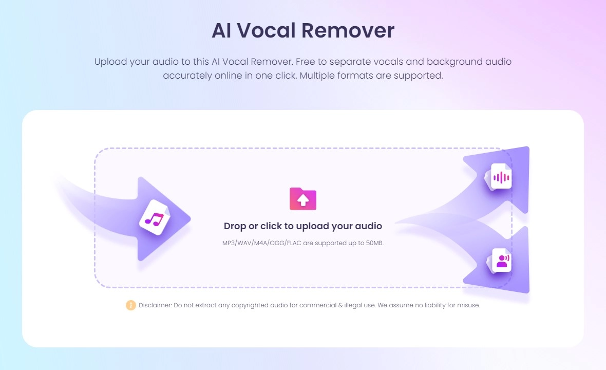 This text to song online program can easily remove vocals from any music recording, producing a pure instrumental version. It is an effective tool for composing new compositions from existing tunes. Want to extract a pure backing track for a song? It's absolutely possible, just upload it to Vidnoz!
