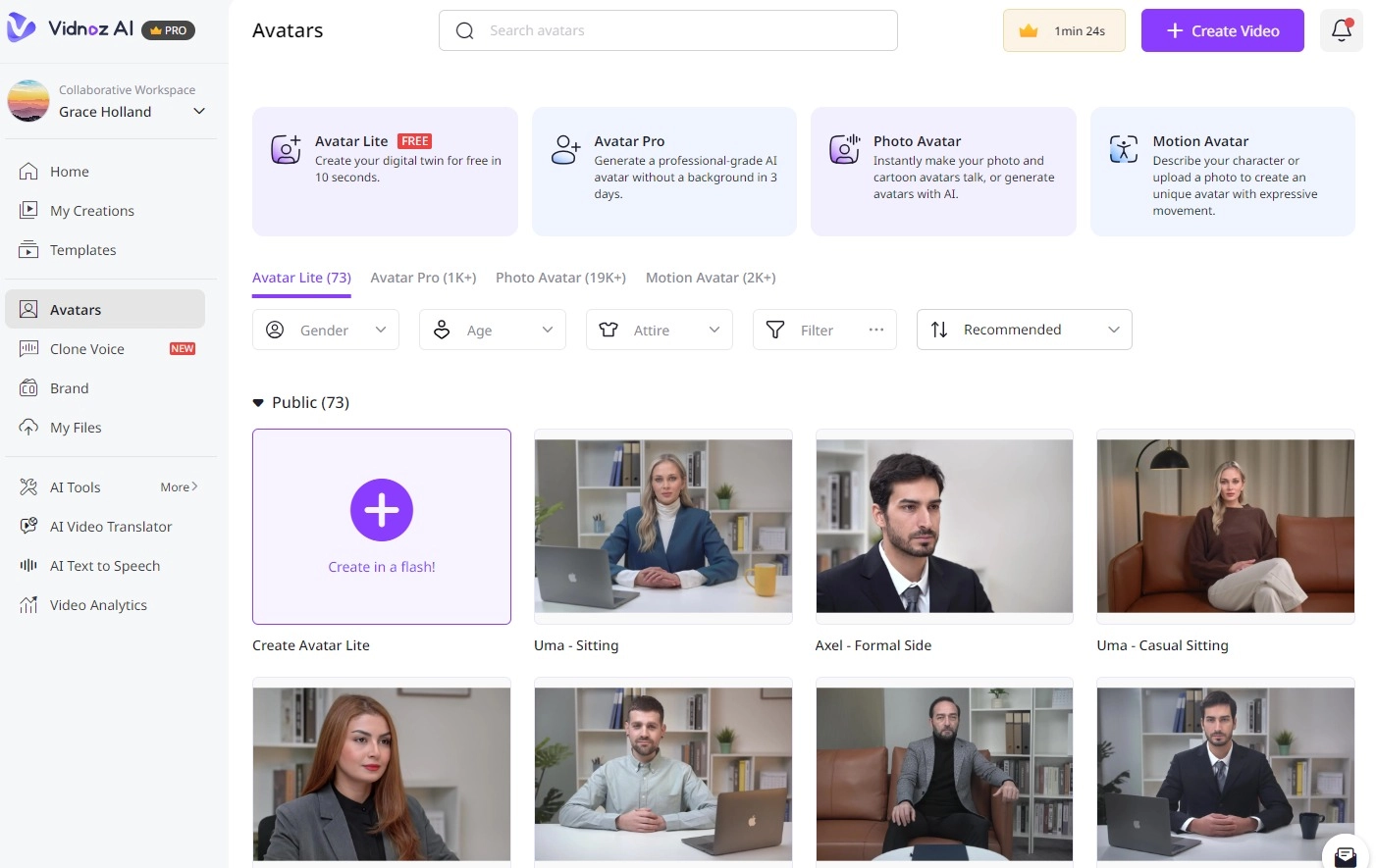 Yes, Vidnoz AI video generator not only helps you create text to speech avatar videos, but also gives you more easy ways to generate videos from texts, PPTs, and so on. It makes video creation quicker and easier than before. In addition, you don’t have to buy expensive devices like cameras and microphones. Let’s look at how Vidnoz AI adopts and combines advanced artificial intelligence to make text to video with avatars. Hundreds of AI avatars with voiceovers are given by Vidnoz AI, which allows you to choose a proper AI avatar that suits your topic, be it business or easy learning courses.