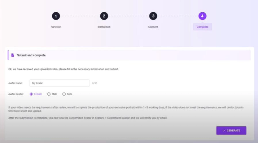 After uploading your video to Vidnoz, click the GENERATE button. You will need to wait 1~3 working days. Please be patient, your custom avatar is being urgently produced by Vidnoz's professional AI team and AI algorithm. This takes a little time to ensure high-quality avatar generation.