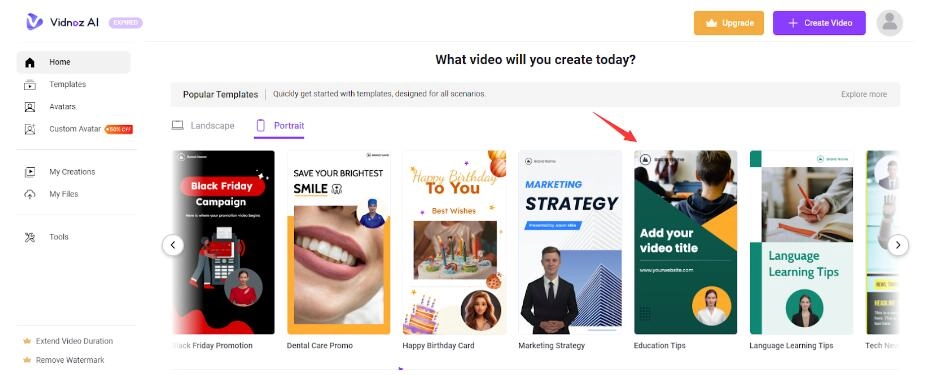 Access Vidnoz AI platform and select a video template for TikTok video creation. You can select a Landscape or a Portrait template that complements your content, whether it's a product demo, explainer video, education tips, or social media post.