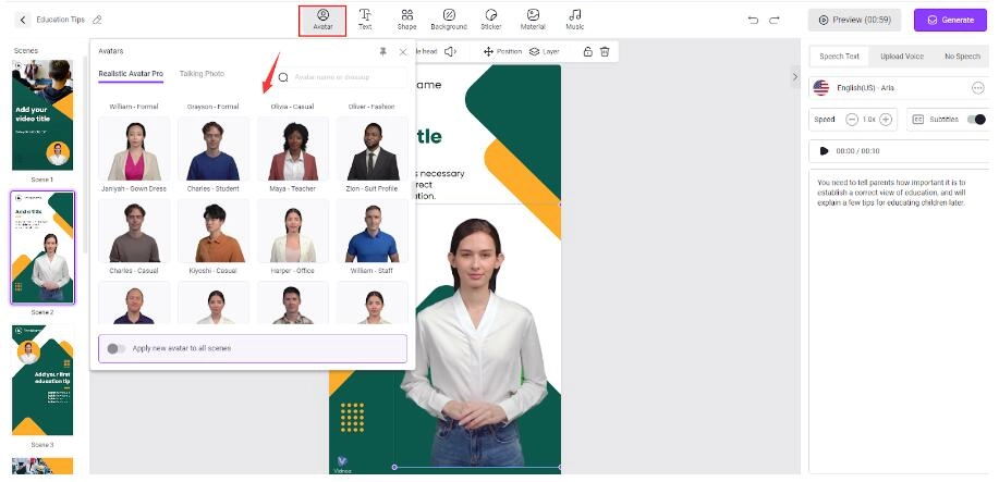The template you choose has an avatar by default, you can choose to use it or choose another one. You can browse and choose from 100+ realistic avatars, considering their appearance, personality, and voice.
