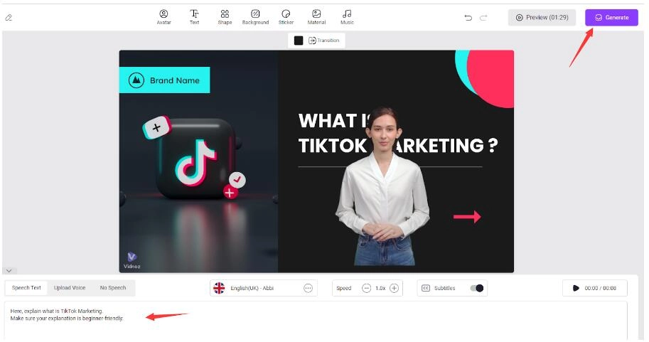 After customizing your video content and adjusting the voiceover settings, as well as finishing other preferences, click the Generate button. Once done, preview the video and download it for sharing on TikTok.