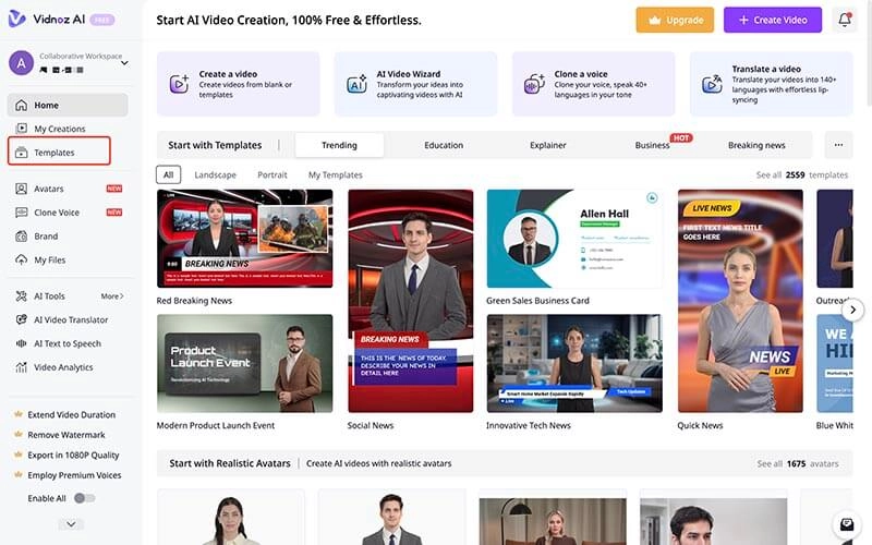 Step 2. Go to Templates and choose a desired one to proceed. You can also start with an avatar by going to the Avatar menu.