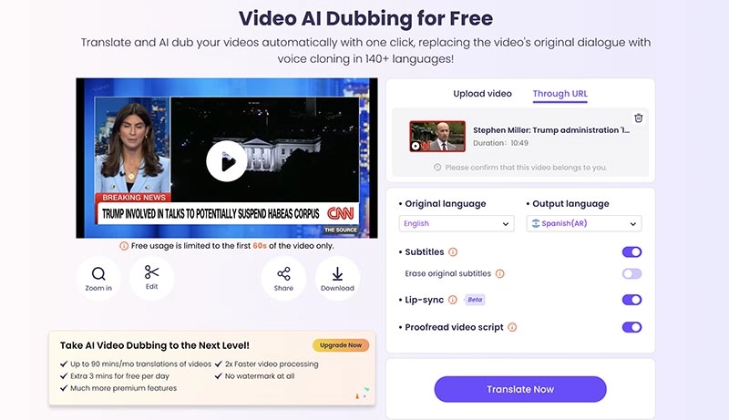 Step 4. Click on the Dub Videos Now to translate YouTube video to Spanish. You can download or share the dubbed video for free.