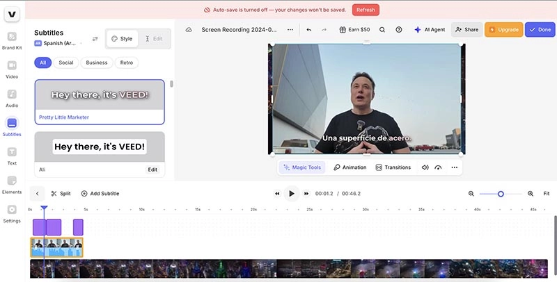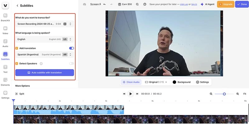 Step 2. Veed will detect the spoken language. Go to Subtitles and set Spanish as the output language.
