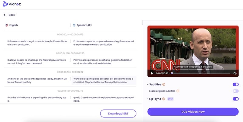 Step 3. Adjust settings for subtitles, lip sync, and proofreading. Click on the Dub Videos Now to proceed. Vidnoz AI will generate an SRT later.