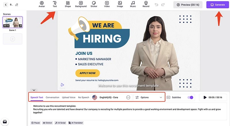 There is no need to hire actors. You can easily create a video for recruitment with more than 1,200+ virtual avatar options.