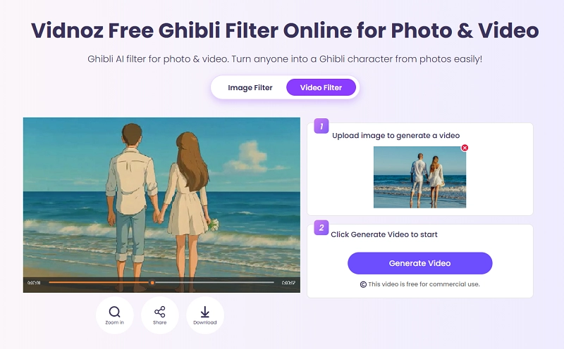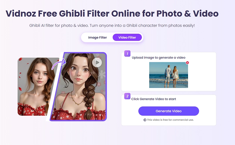 - No cost, no limit: Unlike the other video to anime AI conversion tools we have looked at so far, whose usage requires considerable sums of money, Vidnoz AI Ghibli Filter is a tool you can start using absolutely free of charge, with no limitations.