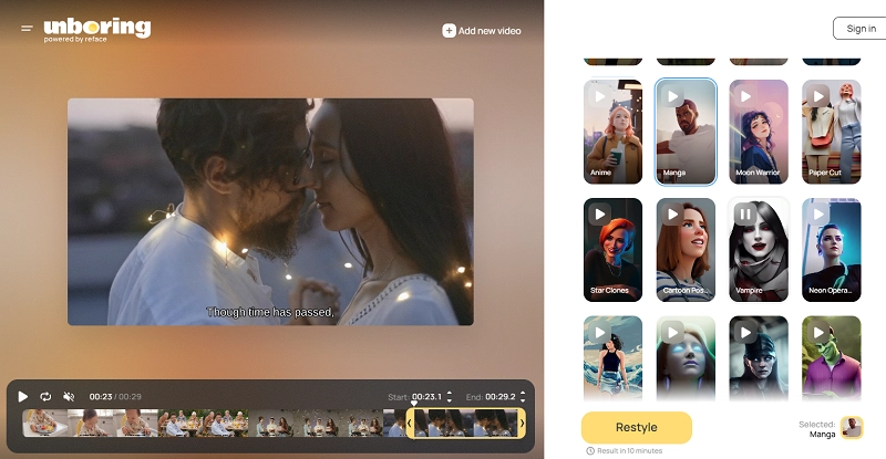 The key things that set the Reface video to anime AI free tool apart are the diversity of anime styles it offers, the high quality of output it gives, and its general user-friendliness. Some of the popular anime styles it offers include Moon Warrior, Pencil Anime, Modern Anime, and Halloween Manga. This AI tool offers 2 pricing packages: Basic at $7.58 per month and Premium at $9.99 per month.