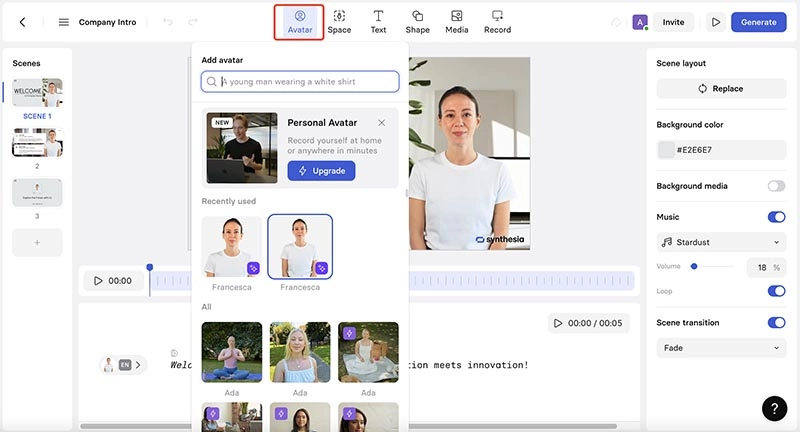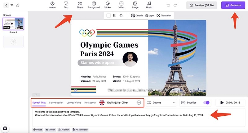 Step 3: Edit the video with the toolbar on top. You can also change the voice avatar here. Click on the Generate button to create a video.