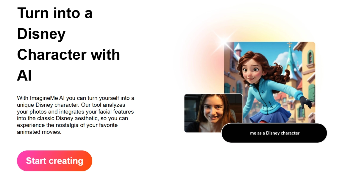 ImagineMe is an AI photo transformer that lets you see what you look like as a specific Disney character. You can just upload my selfie and type in what Disney character you want to be, then the tool will give you a stunning Disney-style image.
