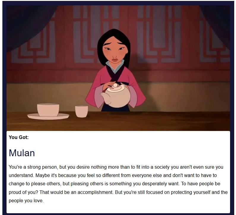 Okay, it generally looks cool. But you may think the answers are not trustworthy. This quiz is purely for entertainment only…Because it offers a short and limited Disney character list, and it gives you different results even if you select the same answers.