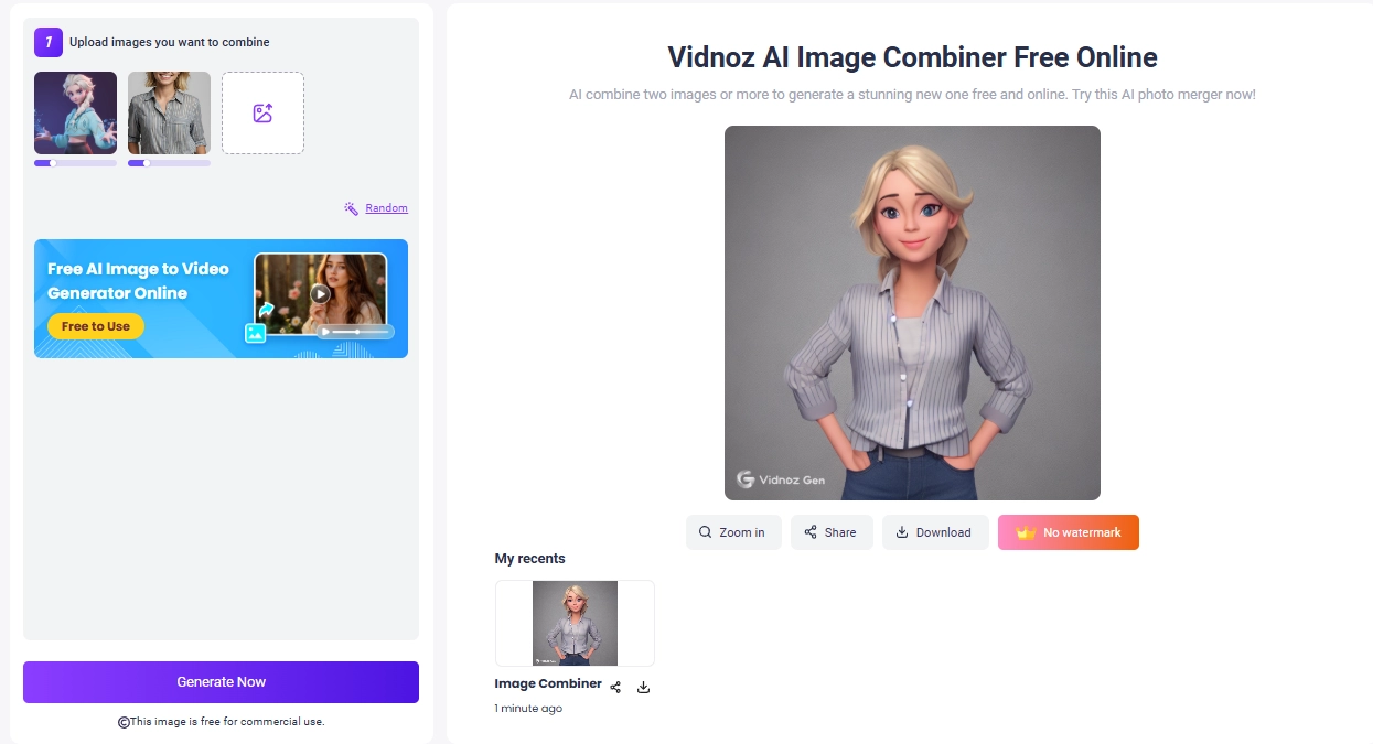 Vidnoz AI image combiner lets you blend you own photo with the Disney character and create you a unique look. All you need to do is uploading a selfie and a picture of any Disney character you want to become, and click on ‘Generate Now.’ In seconds, the tool creates a creative picture that merges your Disney twin into yourself.