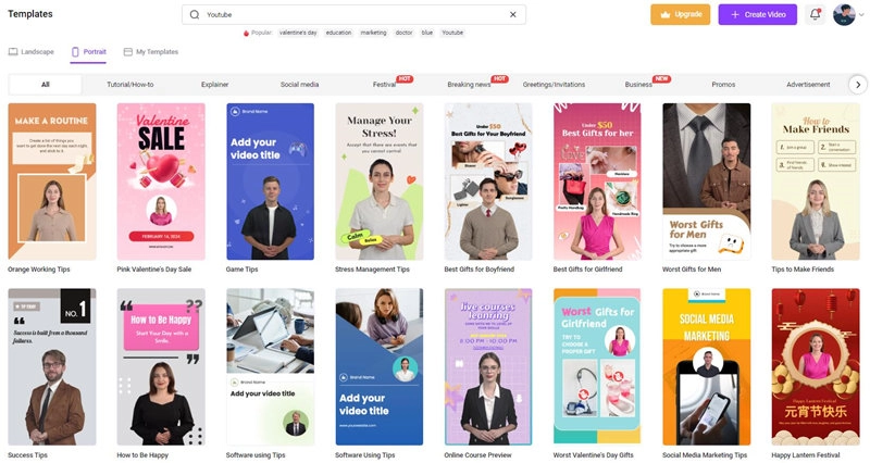 Templates are the key to generating batches of Shorts clips. Vidnoz AI offers 400+ templates for users to choose from, and easily make videos out of the basic frame and structure. Click to see the template gallery to get inspired.