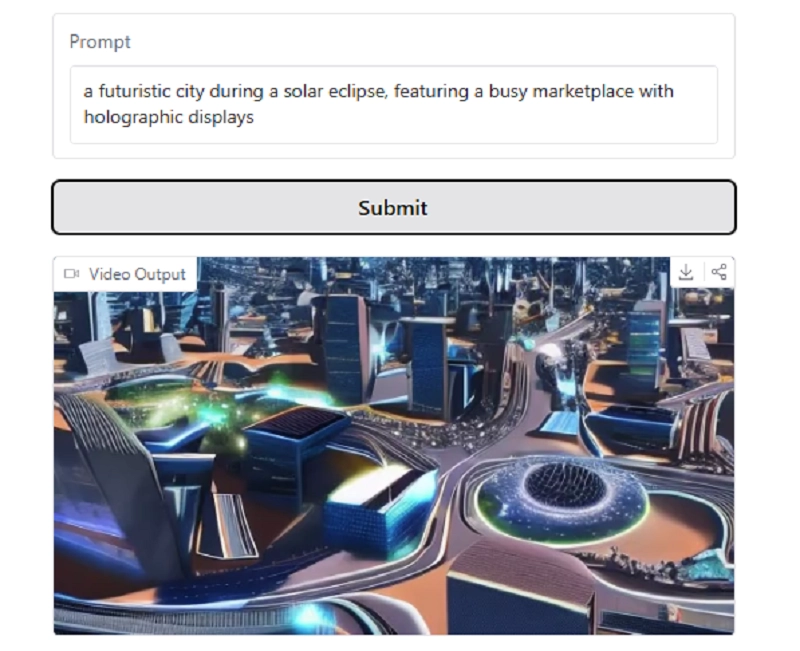 Once you are done with the clear prompt, just click the submit button and leave the rest to Zeroscope. You can preview, review, and make the desired changes to your video by further customizing the settings or providing a new prompt. After making all the required changes, you can conveniently download and share your creativity with just a single tap.