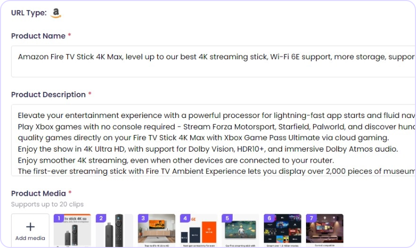 Vidnoz AI URL to Video Generator now enables you to paste URLs from Amazon and Google Play Store. It continuously keeps updating and plans to support more platforms like Shopify, eBay, Apple Store. Stay tuned.