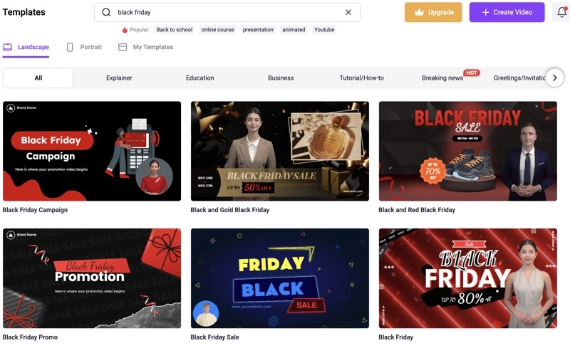 Step 2. Click on "Templates" and search for "Black Friday" to browse all available free video templates in both landscape and portrait formats.