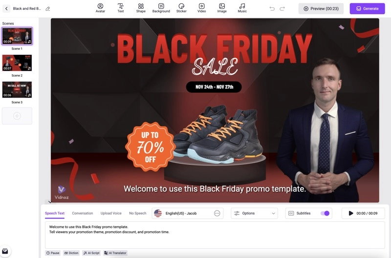 AI video scripts. Vidnoz video generator features an AI-powered script generator. Just input the keywords for your Black Friday promotion, and it will automatically generate an effective script for your video.
