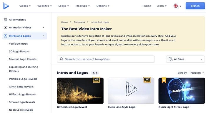 - Renderforest intro maker online has a huge library of templates that cover every theme and style.
