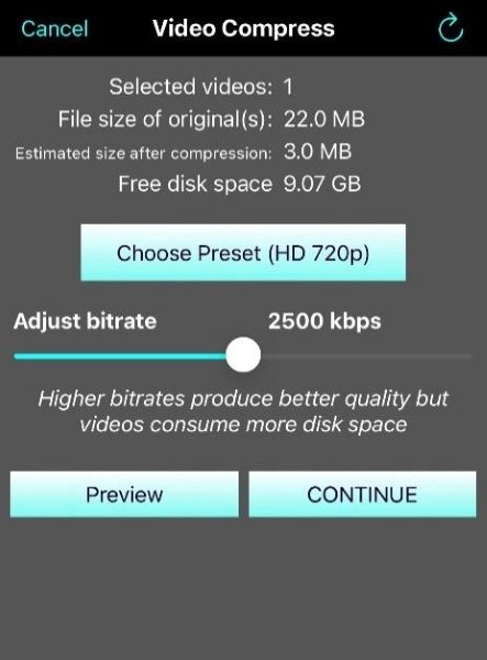 Step4: After this, "continue", and the Shrink Vids app will compress your videos and save them to the Compressed Videos folder.