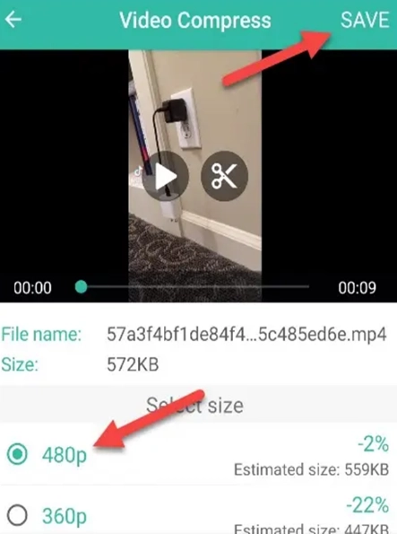 Step 4: You are now able to choose the resolution of the video. The app shows the percentage of the file size that will be reduced.
