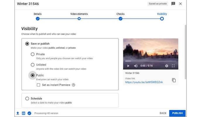 After completing the required information, click the "Publish" option to make your video live on YouTube. Be patient, as the video may take some time to process.