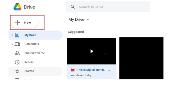 Click the + NEW button under the drive logo in the top left corner. Choose "File upload" in the drop-down menu. Click "Open" to begin the upload procedure after selecting the video file from your computer.