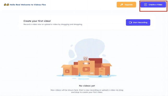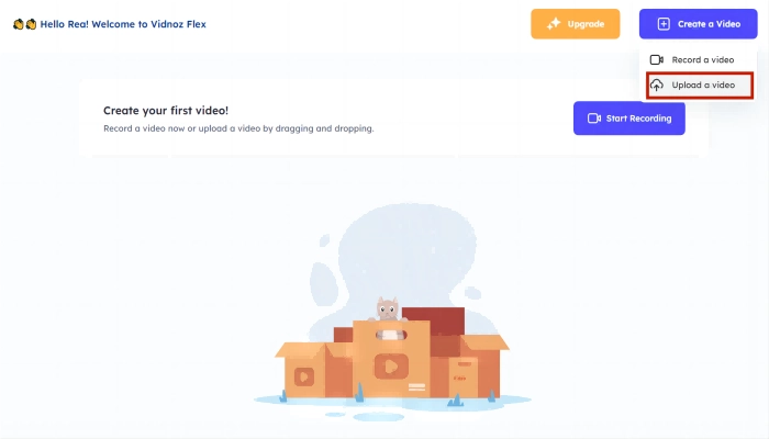 Log in to the Vidnoz Flex website. From there, click on “Create a video: and Vidnoz Flex's built-in recording capability lets you effortlessly record a new video or upload an existing one from your computer.