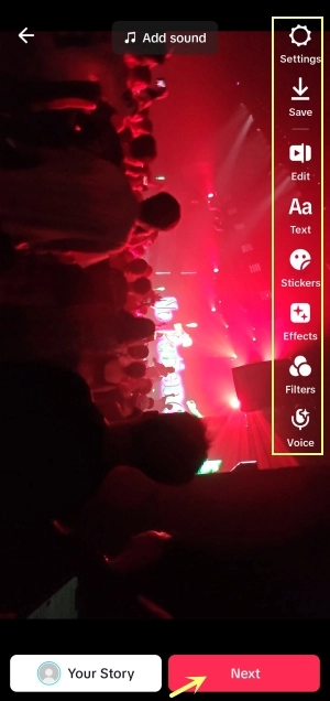 Step 4. Entering in the editing page, select Add sound to insert background music or audio; select Stickers to add emojis, hashtags, polls that viewers can engage with. Plus, other features on the right sidebar like effects, filters, voice effects, and more are waiting to be explored.