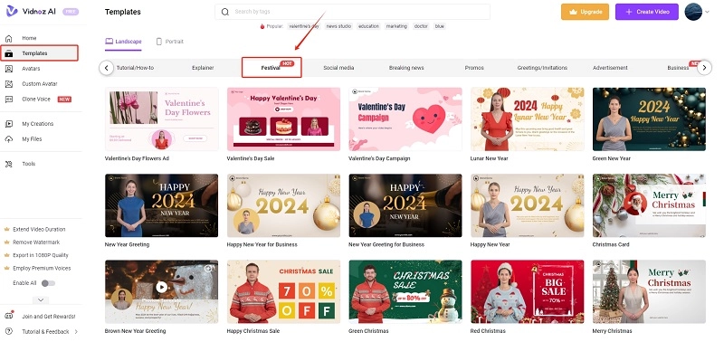 Step 2. Click Templates on the left panel and then select Festival on the right. Choose your preferred Valentine’s Day video template and click on Use this template.