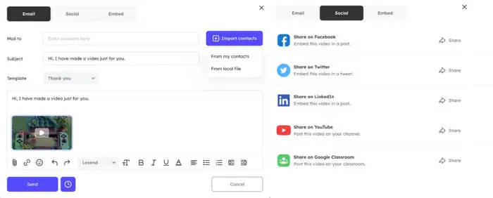 Automated email sharing: Vidnoz Flex provides an effortless way to send campaigns and customer videos via email. You can import a list of contacts and send emails to multiple recipients at one click. There is a trove of ready-made email script templates for different topics, as well.