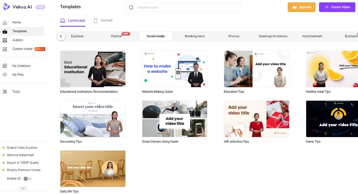 Creating a successful social media marketing strategy can take a lot of effort on your part, so Vidnoz, as a mature AI tool, can help you create outstanding social media marketing videos effortlessly. This AI video generator provides you with a large number of business video templates and has realistic AI talking avatars to help you explain products and marketing points more vividly. Here are some of its outstanding features.