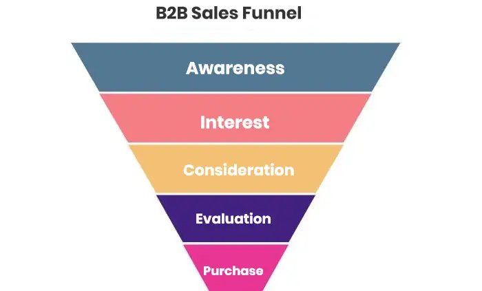 A B2B sales funnel or pipeline refers to a sequence of phases that depicts how B2B prospects move from the beginning to the end. Detailed stages of the B2B sales funnel are awareness, interest, consideration, evaluation, and purchase.